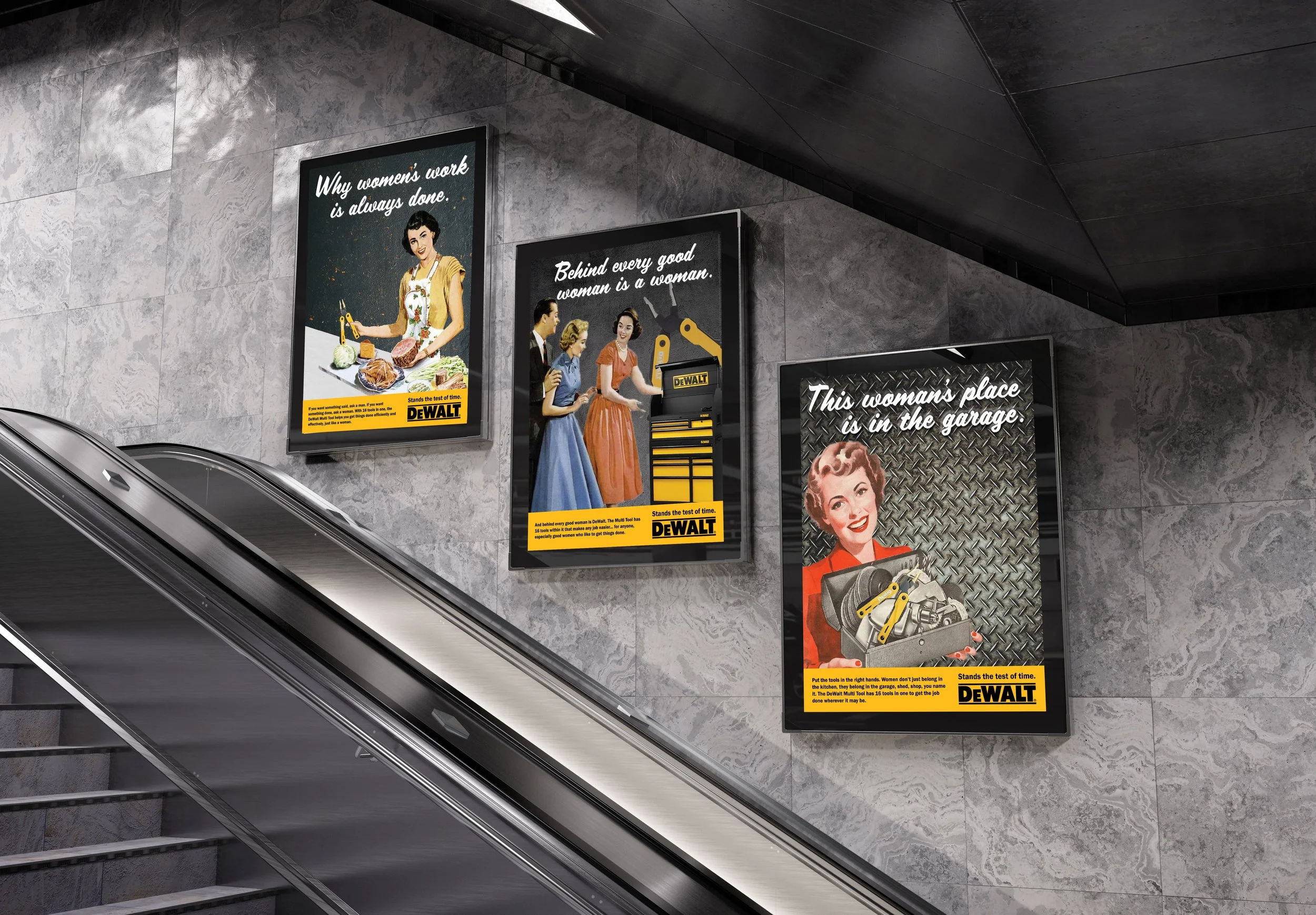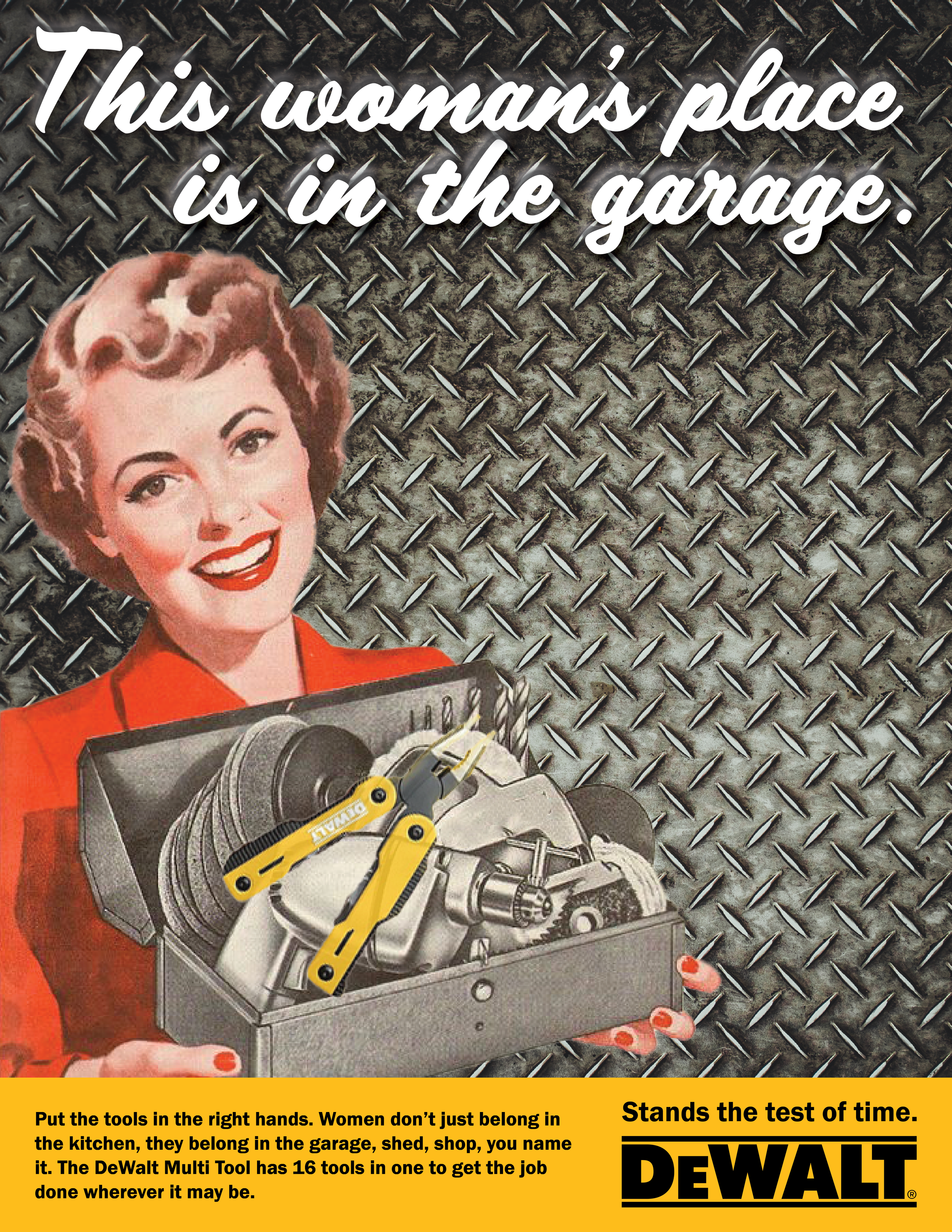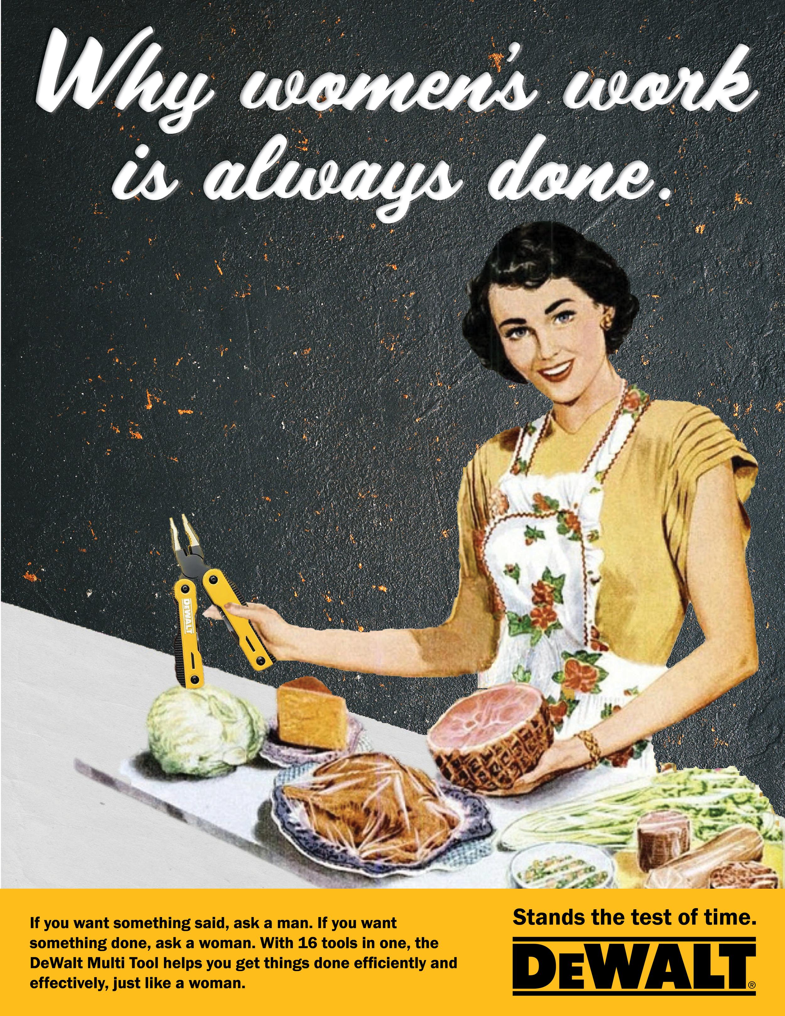 This tool stands the test of time, catering to your average male worker and… 50’s housewives. No matter your challenge, the Multi Tool has 16 tools perfect for anyone to get the job done effectively and efficiently like a woman. The DeWalt brand is currently restricted to mostly blue-collar men, but we leveraged the problem-solving capability of the Multi Tool in this campaign to appeal to everyday issues.
